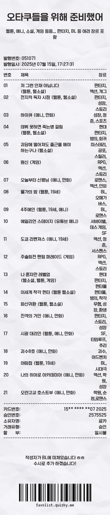 웹툰, 애니, 소설, 게임 등등... 판타지, BL 등 여러 장르 포함