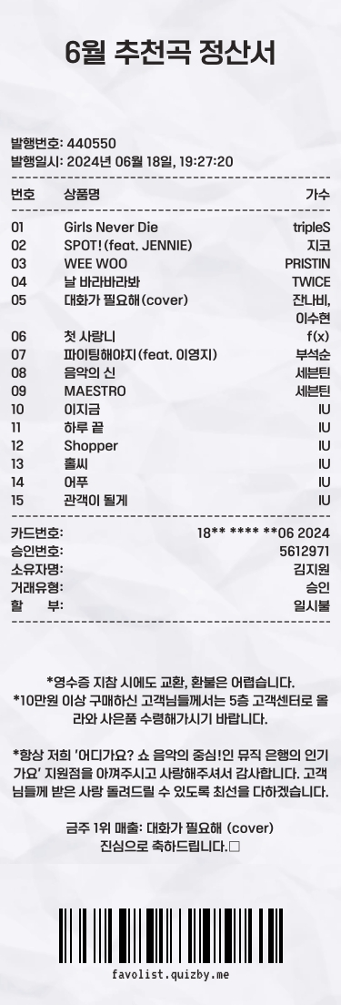 *항상 저희 '어디가요? 쇼 음악의 중심!인 뮤직 은행의 인기가요' 지원점을 아껴주시고 사랑해주셔서 감사합니다. 고객님들께 받은 사랑 돌려드릴 수 있도록 최선을 다하겠습니다.